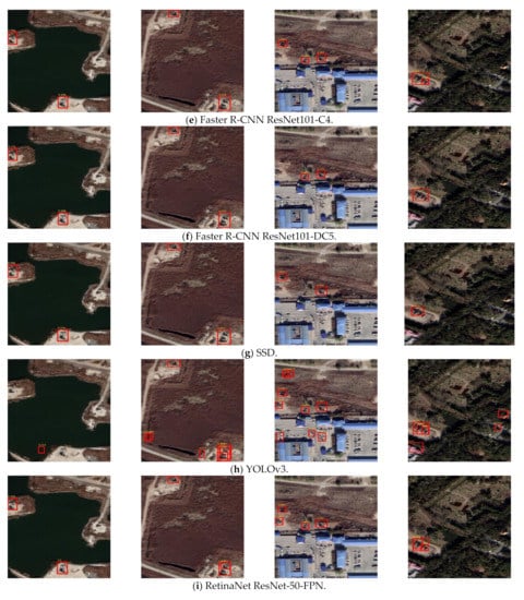 We compared nine different deep learning models for oil well detection. The comparison results are summarized in Table 2 and Table 3. The precision, recall and F1 score are presented for all of the deep learning models at IoU = 0.5 in Table 2. The results show that SSD model achieves the best precision with the shortest training time and lowest memory cost. Faster R-CNN with R101-DC5 backbone has the best performance in recall and F1-score. Faster R-CNN and RetinaNet models have relative high recall and F1-score. In Table 3, different AP have been calculated based different deep learning models. RetinaNet model has the best AP and AP50 compared with all the other models and Faster R-CNN with R50-FPN backbone has the best AP75. Figure 15 shows the samples of the detection results.