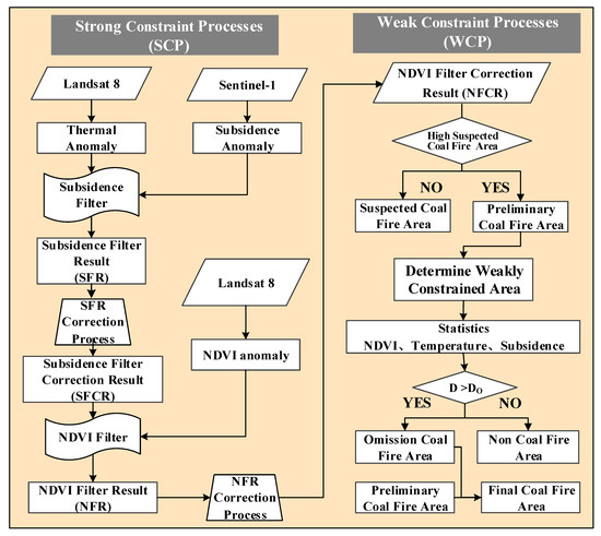 Underground coal fire generates heat, and the combustion process also changes the volume and mechanical properties of surrounding rocks, causing surface collapse. The high temperature caused by coal fires and the precipitated sulfides can seriously hinder vegetation growth. The above phenomena are shown as thermal anomalies in thermal infrared images, small subsidence in time-series interferometric signals, and sparse vegetation in optical images [34]. In addition, after initial experimental investigations, we found that Xinjiang coal fire areas and mining areas are staggered. Several thermal anomaly regions exist in the study area, and some thermal anomaly regions include ground objects with low specific heat capacity affected by solar radiation. This can cause non-coal fire thermal anomaly areas and non-coal fire subsidence areas, which makes it difficult to identify coal fire areas by simple remote sensing technology. To this end, in this study, a multi-source remote sensing method, named SWCM, is proposed for the detection of coal fire areas. This method takes into account the characteristics of thermal anomalies, subsidence, and NDVI and adopts a strong constraint process (SCP) and weak constraint process (WCP) for the identification of fire areas. Among them, the SCP can reduce the influence of non-coal fire-related thermal anomalies and subsidence on coal fire detection, effectively ensuring that the identified fire areas are the real fire areas, while the WCP compensates for the omission error of the fire areas caused by the harsh conditions of the SCP. The flow chart of the method is shown in Figure 3.