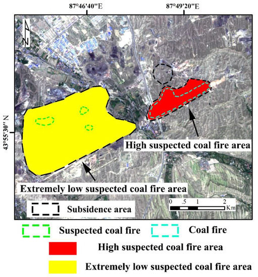 Thermal infrared remote sensing technology is widely used for the identification of coal fire areas, peatland combustion, forest fire, etc. [10,11]. Typically, the first step of this technology to detect coal fires is to invert the surface temperature, and then certain rules are utilized to extract the thermal anomalies on the land surface. This method has been proved to be feasible and time-efficient. Several experiments using Landsat 8 and Advanced Spaceborne Thermal Emission and Reflection Radiometer (ASTER) have been reported, and the results have proved the efficiency of thermal infrared technology in the identification of coal fire areas [12,13,14,15]. However, this technology has some limitations, such as an error in thermal anomaly extraction and non-coal fire thermal anomaly, which can cause non-coal fire areas to be misrecognized as coal fire areas [16]. In addition, it is hard to detect some deeply concealed coal fires by this method. Further, the range of coal fires caused by abandoned small coal mines is usually smaller than that of current medium spatial resolution thermal infrared images, so thermal infrared technology cannot detect the small coal fires.