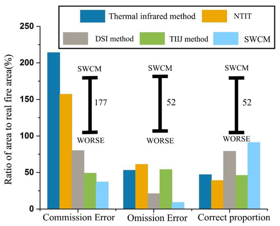 Combining Figure 10 and Figure 11, it is clear that the traditional thermal infrared method exhibits the maximum commission error of coal fire areas (214%), while the commission error of coal fire areas obtained by SWCM is the lowest (37%) and the difference between them is 177%. It is worth mentioning that both the thermal infrared method and NTIT use thermal anomalies to identify coal fire areas. The difference between them is that the former uses daytime data and the latter uses nighttime data. The commission error of NTIT is 157%, which is a 57% reduction relative to the thermal infrared method, showing that nighttime data can reduce the impact of daytime solar radiation, etc., on coal fire detection. The commission error obtained by SWCM is reduced by 70.4% on average when compared to that obtained by other methods. Further, it is observed that the omission error of coal fire areas identified by SWCM is the lowest (9%), and those obtained by the thermal infrared method, NTIT, and TIIJ are relatively high. The omission errors of them are nearly 56%. Compared to the omission errors obtained by the other four methods, omission errors of SWCM are reduced with an average reduction of 30.6%.