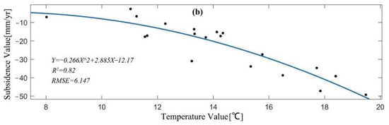 From Figure 15b, it can be seen that the time-series average temperature and the subsidence rate have a good negative correlation in the study area, and the correlation coefficient reaches 0.82. Based on the above analysis, it can be concluded that the subsidence rate is large when the average temperature is high, but there is a delay time between them.