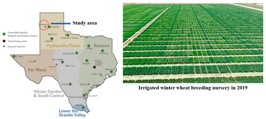 Wheat (Triticum aestivum L.) is the second most important crop in Texas, after cotton (Gossypium spp.), where it is produced under dryland and irrigated conditions for grain and forage. In 2020, it was planted on 1.9 million hectares, of which 0.97 million hectares were harvested for grain with a total production of 16 million Mt [1]. The frequent occurrence of drought poses a threat to winter wheat production in this region and reduces the yield under both the dryland and irrigated conditions [2]. The historic drought of 2011 and 2012 reduced wheat yield in Texas to 1.2 Mt compared to the five-year average of 2.5 Mt per hectare [3]. Another drought episode followed in 2018 when precipitation dropped below 150 mm. The frequent and unpredictable magnitude of drought observed this past decade reinforces the need to prepare for future climate threats.