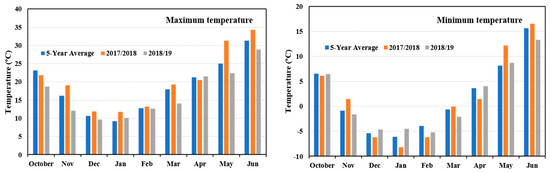 Mean monthly maximum and minimum temperatures during the winter wheat growing season at Bushland, Texas (Source: U.S. Climate Data, www.usclimatedata.com, accessed on 1 January 2021).