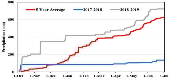 Cumulative precipitation during the winter wheat growing season in Bushland, Texas (Source: U.S. Climate Data, www.usclimatedata.com, accessed on 1 January 2021).