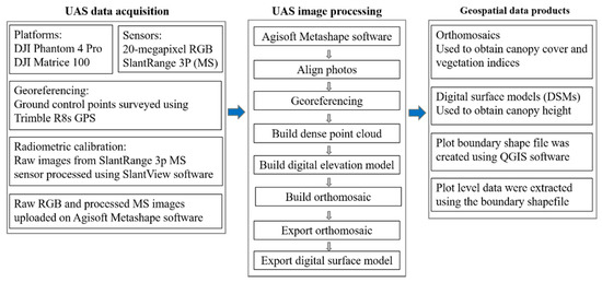 General Unmanned Aerial System (UAS) data collection and processing workflow. MS: Multispectral, GPS: Global Positioning System.