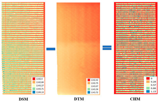 Determination of Canopy Height Model (CHM) by subtracting Digital Terrain Model (DTM) from Digital Surface Model (DSM) obtained from Unmanned Aerial System (UAS). DTM represents bare ground and DSM represent surface model after canopy growth. Elevation measurements displayed in the figure are in meter.