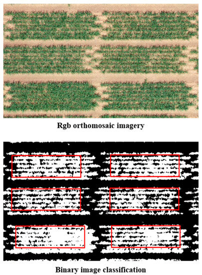 where R, G, and B are Digital Number (DN) values for the red, green, and blue bands, respectively. P1 and P2 are parameters to classify pixels in the green band and P3 sets the minimum value for ExG (Table 2) to select green vegetation. In this study, parameter (P1, P2, and P3) values were set to default as explained in the Canopeo algorithm (P1 = 0.95, P2 = 0.95, and P3 = 20) [42]. A plot boundary polygon layer was overlaid on the classified image and the percentage of canopy cover was calculated using Equation (2) (Figure 7).