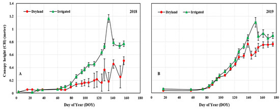 Comparison of Canopy height (CH) distribution between dryland and irrigated environments over the winter wheat growing seasons of 2018 (A) and 2019 (B) at Bushland, TX. CH measurements were obtained from Unmanned Aerial System (UAS)-based Canopy Height Model (CHM). Vertical bars represent standard deviation.