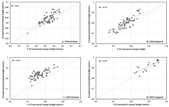 Relationship between ground measured canopy height and Unmanned Aerial System (UAS)-based canopy height (CH) measurements. Each data point represents individual plot measurements. Except in (D) 2019 irrigated (one replication, n = 22), (A–C) all other environments had three replications (n = 63 in 2018 and n = 66 in 2019-dryland). UAS-based CH measurement obtained at 156 Day of Year (DOY) and 175 DOY were used for validation in 2018 and 2019, respectively. Solid line is the 1:1 line and dashed line is the linear regression line.