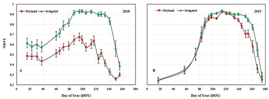 Comparison of Normalized Difference Vegetation Index (NDVI) distribution between dryland and irrigated environments during the winter wheat growing seasons of 2018 (A) and 2019 (B) at Bushland, TX. NDVI was obtained from Unmanned Aerial System (UAS). Each data point is the average across measurements obtained in the respective DOY and environment. Vertical bars represent standard deviation.