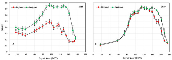 Comparison of Normalized Difference Red-edge Index (NDRE) distribution between dryland and irrigated environments during the winter wheat growing seasons of 2018 (A) and 2019 (B) at Bushland, TX. NDRE was obtained from Unmanned Aerial System (UAS). Each data point is the average across measurements obtained in the respective DOY and environment. Vertical bars represent standard deviation.