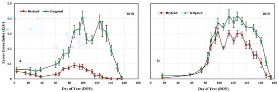 Comparison of Excess Green Index (ExG) distribution between dryland and irrigated environments during the winter wheat growing seasons of 2018 (A) and 2019 (B) at Bushland, TX. ExG was obtained from Unmanned Aerial System (UAS). Each data point is the average across measurements obtained in the respective DOY and environment. Vertical bars represent standard deviation.