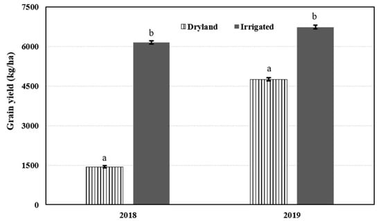 Mean winter wheat grain yield obtained in 2018 and 2019 under dryland and irrigated conditions. Vertical bars represent standard error. Lower case letters show the significant difference between irrigation regimes within year at p < 0.05.