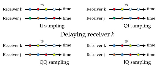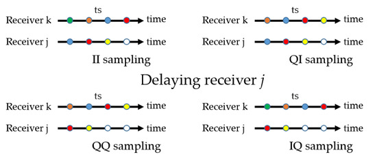The combination of delaying one clock to measure the IQ or QI product and the additional delay of one or other signals results in different overall delays that must be analyzed with care. For example, the IQ product with receiver k delayed (bottom right of Figure 3) for the red snapshot coincides with the QI product with no delay (top right of Figure 2) for the blue snapshot. The same happens between the product QI with receiver j delayed and IQ with no delay.