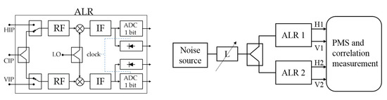 The test bench uses two different ALR units driven by correlated noise provided by a single source and a power divider (see Figure 5, right). Eleven levels are injected in-phase to both units by means of a variable attenuator. Within each ALR unit, the input power is further divided into both H and V channels, as seen in the block diagram at the left of the figure. The digitized output signals are sent to a data processing unit (labeled “PMS and correlation measurement” in the figure) that includes one-clock delays to get the Q signals. The data processing unit includes a matrix of 1-bit two-level digital correlators [13] to compute all correlation pairs between the different ALR output digital signals (H1, V1, H2, V2), including self-IQ for each one. Correlation with additional delays to measure the fringe washing function shape are also implemented. The analog detected output from the diode is converted to a square signal by a voltage to a frequency converter. Both correlation and power data are saved in text files for further processing by a dedicated software.