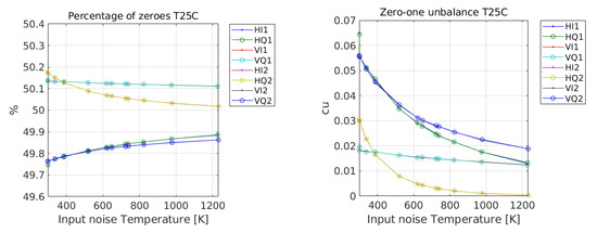 The correlation counts measured by the setup of Figure 5 are first converted to the normalized correlation of the input Gaussian signals using the same method as for the MIRAS instrument on board SMOS and detailed in Equation (2) of [9]. This first step needs the measurement of the correlation of all signals with all ones and all zeroes in order to calibrate the correlator offset. While in MIRAS, this correction was important (see Figure 14 of [10]), in this case, this correction was shown to be almost negligible due to the improved design of the samplers and the correlators. Figure 7 shows the percentage of zeroes and ones in all signals and also the estimated offset due to the zero-one unbalance expressed in correlation units (cu), defined as . Results for all I and Q signals are provided; however, as expected, the zero-one unbalance for any Q signal is identical to the corresponding I signal since they are both the same, and only a delay is introduced to get one from the other.