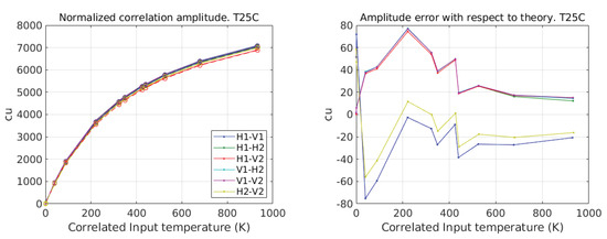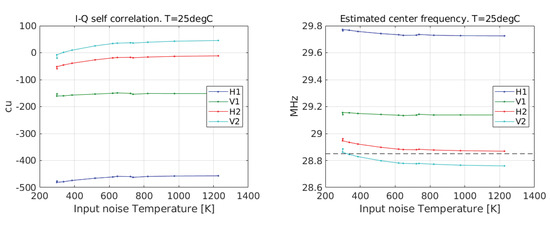 The complex cross-correlation, both nominal and redundant, is computed out of the raw measurements provided by the setup of Figure 5 according to Equations (20) and (21) and using the approximation (28), the nominal bandwidth, and the center frequency error estimated in Figure 8. Figure 9 shows the results in amplitude (correlation units) after averaging nominal and redundant retrievals as a function of the correlated input noise temperature (48). Shown also in the plot (circles) is the expected theoretical cross-correlation computed using Equation (29) of [14], repeated here for convenience: