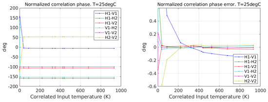 Figure 10 shows the phase of the complex correlation as a function of correlated input temperature. As seen, it is almost constant for all baselines with variations lower than , except for the baseline H1-V1, which has a larger variation. For low values of input power, the uncertainty in the phase is very large, as expected.