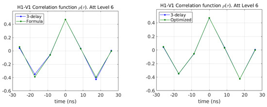 Equations for retrieving the fringe washing function are derived in Section 2.5. They are based on introducing additional delays to each one of the signals and measuring the corresponding correlation. This feature has been implemented in the setup of Figure 5, and the results are given below. Figure 11 shows the measured real correlation between signals H1 and V1 for Noise Level 6 (see Figure 6) at the seven time delays specified in Equations (36)–(42). For points where there are two measurements (all except the first and the last ones), the average value is used. The theoretical value computed from (45) is drawn in the same figure using first-guess values of the unknown parameters. Specifically, and are the amplitude and phase of the correlation obtained in Section 3.2.2; and B are set to their nominal values; and is set to zero. As seen, even though using approximate parameters, the measured values of correlation match quite well with the theoretical expectations.