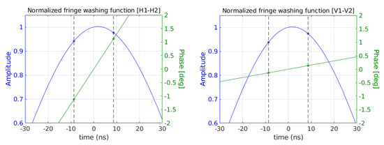 Since the actual receivers’ center frequency may differ from the nominal one , the fringe washing function is in general complex and not-symmetrical around the origin (see Appendix A). In any case, (12) implies that , and neglecting the normalized fringe washing function, , demonstrating that this concept is able to recover both the real and the imaginary parts of the normalized complex correlation and hence of the visibility. In general, due to the time delay, the imaginary part is affected by some degree of decorrelation quantified by the normalized fringe washing function. This one can be important for systems with a large bandwidth, but can be compensated by proper processing, as explained in Section 2.4.1.