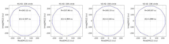 Figure 13 shows the results for a circle corresponding to injecting about 15k of correlated noise. Only four baselines are shown since the local oscillator distribution between the H and V channels within the ALR is fixed, and its phase cannot be changed. These are applied only to baselines formed by ALR 1 and ALR 2. As seen, for all baselines, a circle is correctly retrieved. The radius and the center is indicated in the figure.
