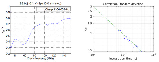 For the proposed digital IQ demodulation, the sampling rate must be set equal to four times the center IF. This is larger than the minimum Nyquist rate of twice the signal bandwidth, so some level of oversampling is present, which is beneficial in terms of noise reduction. The effective integration time taking into account actual filters’ response and one-bit digital correlator is estimated as a function of the sampling frequency using the method outlined in [17]. The result for the parameters of the hardware designed are provided in Figure 14, left. It should be pointed out that the filters used in this simulation are prototypes measured for SMOS, not the actual units used in the ALR, so some discrepancy is expected. As seen, the oversampling allows having an effective integration time of about times the actual value for the sampling frequency of used in the test. This result is much better than the ratio of of SMOS [17]. Note the local maximum at MHz and also the stabilization after about 80 MHz, compatible with twice the maximum frequency of the signal spectrum MHz. For an ideal case of no quantization and ideal rectangular filters, the effective integration time is equal to the actual one in these two cases and keeps constant beyond the last one.