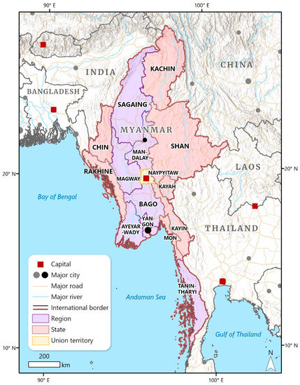 We obtained geospatial data on Myanmar’s 15 first-level administrative divisions (among them seven regions, seven states, and one union territory comprising the capital) and six special administrative zones/divisions from the Myanmar Information Management Unit (MIMU) (http://themimu.info/ (accessed on 10 January 2021)), an entity managed by the United Nations Resident and Humanitarian Coordinator in Myanmar. Although we noted that these datasets were largely digitized at a 1:250,000 scale, and that administrative boundaries remain contested on the ground [67], MIMU’s data provided sufficient granularity and accuracy for our internal comparisons. Myanmar’s international land borders, which it shares with five countries—China (2185 km), Thailand (1800 km), India (1463 km), Laos (235 km), and Bangladesh (193 km) [80]—were delineated based on the Food and Agriculture Organization’s Global Administrative Unit Layers (GAUL) 2015 version (Figure 1). We also supplemented our visualizations with road data from the Open Street Map (2021), additional road and river data from Natural Earth (2021), and ESRI topographical base maps.