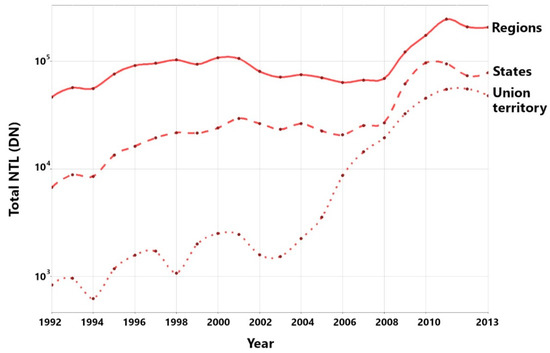 Total nighttime light (NTL) for states, regions, and the union territory (Naypyitaw) (1992–2013).
