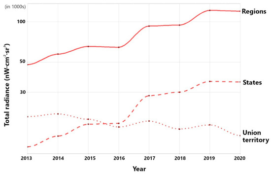Average radiance per km2 by type of administrative division (2013–2020).