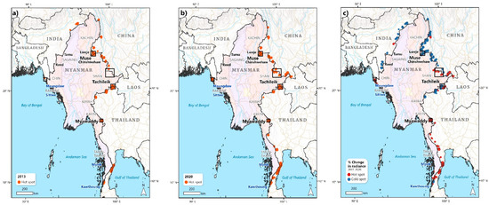 (a) Radiance (ln) hot spots in 2013; (b) radiance (ln) hot spots in 2020; (c) hot spots of percent change in radiance between 2013 and 2020. Myanmar’s 11 official border crossings are labeled (with maritime crossings in blue). Insets relate to the three locations inspected in Figure 8.