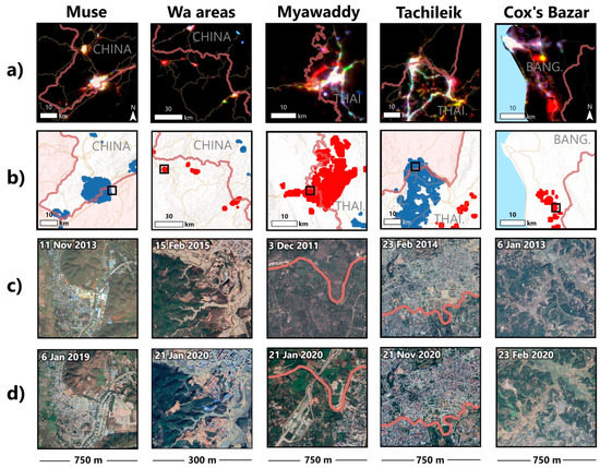 We apply a critical remote sensing approach [71] integrating satellite imagery and qualitative data drawn from a review of scholarly and gray literature and ethnographic fieldwork in Myanmar, where one of the article’s authors has conducted research on development, environment, and governance since 2013 with attention to resource frontiers in the country’s borderlands [72]. Our research brings geospatial data into conversation with debates on borderlands, contested authority, and territory [73,74,75] to offer two main contributions. Empirically, we build a more complete picture of the fractious geopolitics of development in Myanmar and its borderlands, highlighting the continued importance of resource extraction as well as the recent impacts of forced migration and internal displacement. Methodologically, we demonstrate how long-term ethnography and other qualitative studies can inform and contextualize NTL analysis of geopolitically complex spaces.