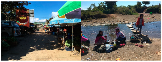 Myanmar vendors sell vegetables and Indian women wash laundry at the official (left) and unofficial (right) international border crossings between Myanmar and India at Tamu–Moreh. Author’s photos, December 2018.
