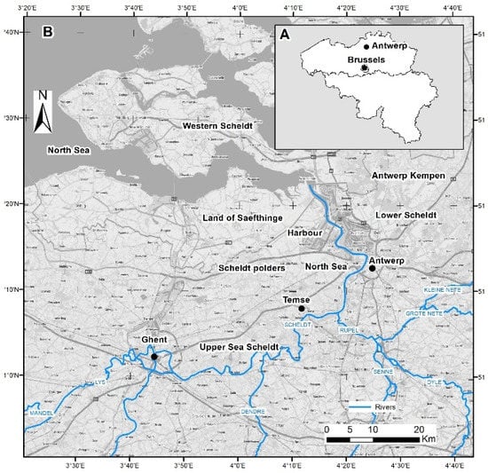 The region of interest (ROI) is in the northern part of Belgium along the Scheldt valley till its mouth in the North Sea and comprises the Dutch border, the city centre of Antwerp and the harbour. The river Scheldt originates at Saint Quentin (France) and is rain-fed by a catchment of approximately 21.863 km2, which is drained by the river and its branches to the North Sea near Vlissingen (The Netherlands) []. The river Scheldt is situated in the north-western part of France, the western part of Belgium, and the southwestern part of The Netherlands. The 355 km long river can be divided from its source to the mouth into the Upper Sea Scheldt and the tidally influenced part, composed of the Lower Sea Scheldt and the Western Scheldt. In the ROI, two main rivers join the Scheldt: the Durme, and the Rupel (Figure 1). Most of the river basin area in the ROI is urbanized, with an average density of about 477 inhabitants per km2 []. The importance of the Scheldt for shipping purposes increased in the 19th century, which led to digging of docks in the polder landscape of the estuary. Since the middle of the 20th century, major industrial and urban development took place. About 16% of the total surface of the whole estuary was lost in the last century []; especially, the surface of the Western Scheldt decreased from 45,000 ha in 1800 to 30,000 ha today and the length of the river became 10.5 km shorter.