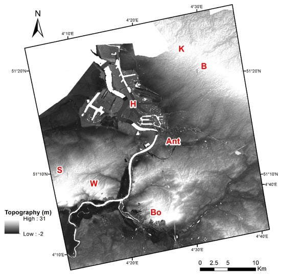 Human activities are concentrated in the Lower Sea Scheldt where agglomerations and industries historically developed close to the estuary. The port of Antwerp plays a significant role associated to the intensive urbanized development of Antwerp and the 1.2 million inhabitants in the metropolitan area. The harbour area is highly modified by human activities since the Middle Ages. Polders were created but most of them have disappeared in the last 80 years. The constant natural evolution of the area due to the estuarine conditions implies that the situation remains in a fragile equilibrium. This area is an almost flat low-lying region. The altitude in the Scheldt polders area varies between roughly 0.5 to 5 m, which makes it easily flooded by high tides without the presence of the dikes. The low altitude of the land in comparison with its direct borders is principally due to the drainage of the peat and its extraction since the Roman time until the 15th century along the left bank of the Western Scheldt estuary []. In the harbour area, the natural topography was raised by adding a thickness of 8–10 m of landfills. To the north east at the transition between the Scheldt polders and the Antwerp Kempen area, the topography rises from 5 to 30 m in Kalmthout on the Brabant Wall (Figure 2). The Wase Cuesta is located south of the Polders area and west of the Scheldt on top of the stiff north-dipping clay deposits of the Boom Formation. The cuesta has a steeply sloping front in the south and is bordered by the Scheldt and the Durme rivers. The cuesta is slightly dipping to the north. The maximum height of the Wase Cuesta is approximately 30 m. To the east of the Scheldt. A similar cuesta called the Boom Cuesta is bordered to the south by the Rupel and Nethe rivers. Along the southern and western edges of the cuesta, the topography is strongly affected by the intensive exploitation of the clayey deposits of the Boom Formation for the brick industry [].