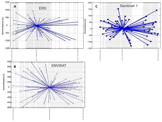 Normal Baselines in m versus Time acquisition graphs for the three SAR image datasets related to (A). ERS, (B). ENVISAT and (C). Sentinel 1.