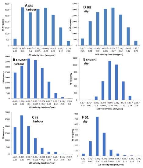 Histograms based on the annual average LOS velocities (in mm/year) of the PS in the Antwerp harbour and city areas, respectively, for ERS (A,D); ENVISAT (B,E); S1 (C,F).