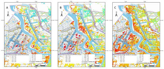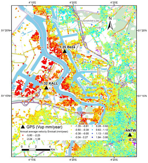 During the ERS period (1992–2001), the LOS velocities range from −5.8 to 2.41 mm/year (Figure 6A). A clear, distinct area haracterized by negative annual average LOS velocities suggest a subsidence motion located along the Scheldt river and the harbour facilities on both sides of the Scheldt river. The western side of the river is haracterized by a 20 km wide area of negative LOS velocity values. On the eastern side of the river, the lowest velocity values are concentrated inside a narrow area bordering the riverbank. At the extreme SW of the image, in Sint-Niklaas (S), the area shows positive average LOS velocity values indicating that this region is probably uplifting due to groundwater rebound as already highlighted in other areas in Belgium (e.g., around the cities of Merchtem and Londerzeel []. The city centre of Antwerp (Ant) is essentially coloured in greenish and, thus, has average annual LOS velocities around 0 mm/year.