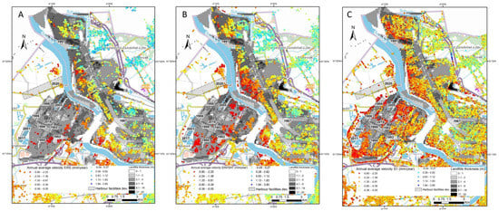 Latest developments of the Antwerp harbour (hatched pattern polygons) with the dates (in bold black) when the constructions ended. Colour classification (red to blue filled dots) based on the average annual LOS velocities of PS points during (A). ERS (1992–2001) (B). ENVISAT (2003–2010) (C) S1 (2016–2019) periods. Thickness in meters for the landfills (white to black filled polygons). Background IGN topographic-map.