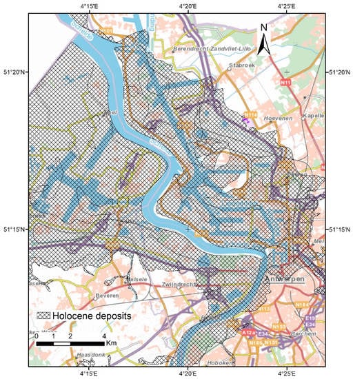 - Adams, R.; Vermeire, S.; De Moor, G.; Jacobs, P.; Louwye, S.; Polfliet, T. Toelichting Bij de Quartairgeologische Kaart. Kaartblad 15 Antwerp. 2002. [Google Scholar]