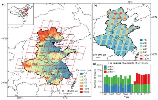 Figure 1. Location of the study area and the availability of Landsat images for 1999–2019. (a) Location of the study area and its topography; (b) the number of available Landsat images during 1999–2019 (the number of available Landsat images per growing season of winter wheat are shown in Figure S1); (c) the number of available Landsat images by sensors (Landsat-5/7/8), the year 1999 denotes the growing season covering 1999–2000 (1 October 1999–30 June 2000), etc.