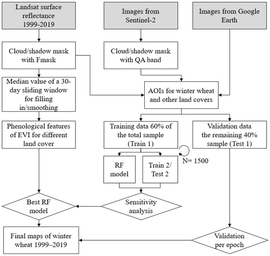 The workflow of mapping winter wheat planting areas includes four steps (Figure 3). Firstly, we extracted time series of EVI from Landsat images and used the cloud-free pixels to derive EVI based metrics that discriminate winter wheat against other land cover types. Secondly, we created training and validation sample sets using high-/medium-resolution imagery from GE online mapping service, Sentinel-2 and Landsat (Figure 2) and implemented a sensitivity analysis to derive the best ratio of training sample (β) for an optimal balance between user’s (overestimation) accuracy and producer’s (underestimation) accuracy. Thirdly, we used the β-adjusted training sample to train the RF model with the input of EVI based metrics to generate winter wheat planting areas for 1999–2019. Finally, we used sample from step 2 for validation and analyzed spatio-temporal changes in winter wheat planting areas.