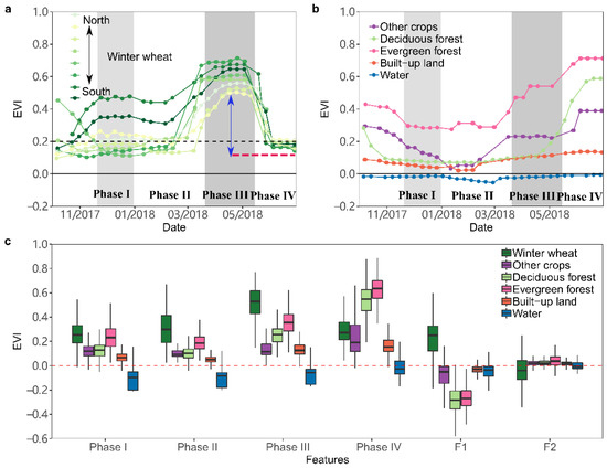We averaged the smoothed EVI for the Phase I (20 October–31 December; covering the period of seedling and tillering), Phase II (10 January–25 February; over-wintering), Phase III (20 March–15 May or 10 April–31 May; jointing/heading) and Phase IV (20 May–30 June or 1 June–30 June; maturing) to derive four EVI based metrics that are used to classify the winter wheat against other land cover types (Figure 4a,b). Two different dates for Phase III and Phase IV were applied for the northern and southern study area, defined by the transection of the latitude 34.57N degree and determined by the change in winter wheat phenology (Figure 4a) from northern to southern zones. The different dates are implemented using the grids (80 × 80 km) for reference samplings shown in Figure 2a. We further calculated the Feature 1 (F1) and Feature 2 (F2) as the difference in EVI average values between phase I-II and III-IV, respectively. These six image composite metrics represent the inputs for RF model training. A distinct difference between winter wheat and the other land cover is observed from several of the EVI metrics derived (Figure 4) and particularly so for the F1. The use of average EVI over a given phase has the advantage of reducing the influence from gaps in Landsat image availability.