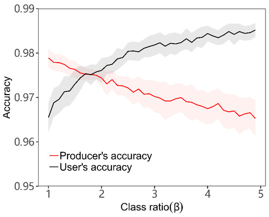 Figure 5. Estimates of the optimal class ratio (β) that achieves a balance between user’s accuracy (black line) and producer’s accuracy (red line). The lines indicating the mean of the accuracies were produced from 10-fold subsampling runs for each β. The shadings show 95% confidence intervals. An optimal ratio of β = 1.8 was derived and applied for all years of classification.