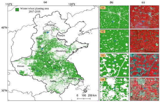 Figure 6. Map of winter wheat planting areas for the 2017–2018 cropping season (a,b) zoom-ins for the site S1, S2, S3 and S4, marked as blue crosses in (a). The false-color composites for visual interpretation (c) are based on average values of bands (SWIR1/ NIR/ Red) of Landsat-8 in March 2018.