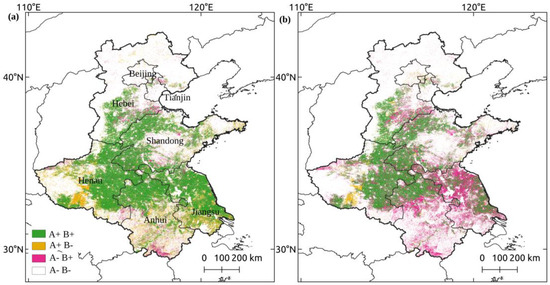 Figure 8. Comparison of the developed winter wheat mapping with the recent published mapping of winter wheat in 2007–2018. (a) Comparison with the result of ref [31]; (b) Comparison with the result of ref. [32]. A+B+ denotes both studies agree on the winter wheat mapping, A+B− denotes winter wheat mapped in the cited study but not in our study, A−B+ denotes winter wheat mapped in our study but not in the cited study, A−B− denotes that winter wheat are not mapped in any of the studies. The corresponding winter wheat maps are shown in Supplementary (Figure S6).
