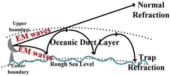 The oceanic tropospheric duct often occurs in sea areas with large negative refraction gradients. [1]. The propagation process of electromagnetic (EM) waves in an oceanic duct is shown in Figure 1. The duct traps EM waves at a particular frequency and elevation range and changes their propagation direction. EM waves propagate periodically in the duct layer with a weak propagation loss as they propagate in a metal conduit [2]. In oceanic ducts, the propagation loss of radar radio waves is frequently weaker than in environments with normal refractive indices; hence, the coverage and range of remote sensing-based detection capability will be expanded [3,4]. Correspondingly, oceanic ducts will also produce adverse effects, such as communication blind spots and electromagnetic holes. The propagation loss of EM waves in the oceanic tropospheric duct is an important concept in oceanic duct research and has important applications in the performance evaluation of remote sensing radar, the design and evaluation of maritime communication systems, and the monitoring theory of oceanic atmospheric ducts. Therefore, the study of the propagation loss of EM waves in an oceanic duct environment can aid in improving the performance of remote sensing radar or communication systems, as well as fully utilizing the information conveyed by the propagation loss to study the joint inversion of atmospheric ducts [5,6,7,8].