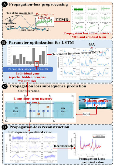 Inspired by the above methods, a new method of predicting propagation loss in an oceanic duct is proposed in this paper by combining EEMD, GA, and LSTM networks. The specific construction is as follows: (1) using EEMD, the original propagation-loss sequence in the oceanic duct environment is decomposed into a limited number of propagation loss subsequences representing different frequency characteristics while stabilizing the data; (2) according to the characteristics of each subsequence, the GA optimizes the parameters for the corresponding LSTM predictor; and (3) the optimized LSTM predictors are used to predict the subsequences. The prediction results are reconstructed into the prediction value of the propagation loss in the oceanic duct environment.