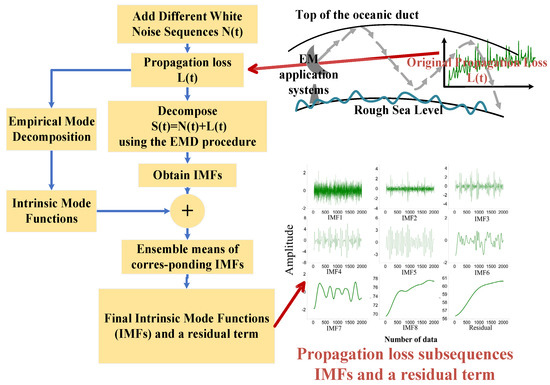 An at-sea EM application system emits EM waves that are trapped in the oceanic duct layer. EM waves inevitably experience losses during the propagation process. This is caused by the natural diffusion of EM waves with distance, the absorption of media, and the refraction and scattering by obstacles in the propagation space. In other words, the EM wave propagation loss in an actual oceanic duct is a multivariate nonlinear function composed of EM system parameters (for example, emission frequency, polarization mode, and emission angle), marine environment parameters, and noise signals. In actual large-scale sea areas, the marine environmental factors that cause EM wave propagation loss change gradually and randomly. The original EM wave propagation-loss sequence is a nonlinear and nonstationary signal. Therefore, we propose EEMD [41] as a data preprocessing method. EEMD is an adaptive signal time-frequency analysis method. It autonomously extracts the IMFs and a residual term of the signal based on the characteristics of the propagation loss signal. This method is suitable for analyzing nonlinear and nonstationary signals. According to the characteristics of the original propagation loss sequence, EEMD can adaptively decompose the propagation-loss sequence into a limited number of IMFs while reducing noise and maintaining data stability. Each IMF component decomposed by EEMD contains the local characteristic signals of different time scales of the original propagation loss. The propagation-loss preprocessing is shown in Figure 3.