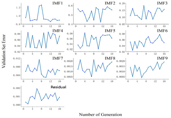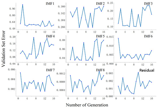 This section discusses the hyperparameter optimization of the LSTM prediction layer of the proposed method. A GA was used to optimize the three high-frequency hyperparameters (namely, number of epochs, number of hidden neurons, and window size). First, the GA randomly generated the initial population of chromosomes composed of the three hyperparameters according to the restriction conditions. The RMSE was used as an individual fitness evaluation function, and the GA operations (selection, mutation, and crossover) simulated the rule of natural superiority after several generations until the number of generations reached the stopping criterion. Finally, the chromosome with the best fitness index was used to configure the LSTM NN. Figure 5 shows that in the oceanic evaporation duct environment, the validation-set RMSE of the subsequence of propagation-loss 1 changed with the generated iteration times. Figure 5 also shows that the trend of the validation-set RMSE fluctuated at the beginning, and after the validation-set RMSE attained its minimum value, the overall trend was to increase and become stable. This also indicated that when the GA was used to optimize the hyperparameter of the proposed propagation-loss-prediction method, more was not always better for the generated iteration number.