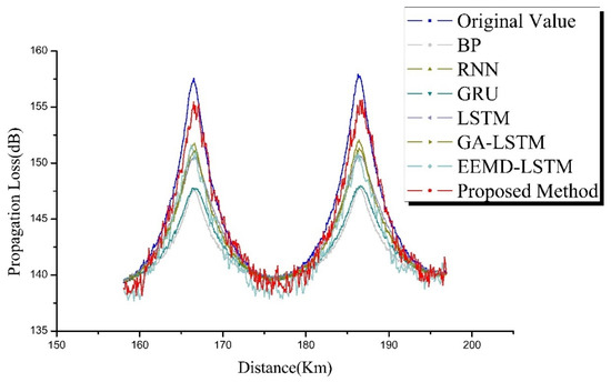 As Table 4 shows, for the propagation loss predictions for the evaporation duct environment, the proposed method had a higher propagation-loss prediction accuracy than the other comparison methods; for instance, compared with the BP, RNN, GRU, LSTM, GA–LSTM, and EEMD–LSTM methods, the percentage improvements in RMSE were 57.41%, 74.54%, 69.97%, 59.96%, 31.65%, and 40.26%, respectively; and the percentage improvements in the MAE were 70.47%, 68.42%, 66.78%, 30.02%, 16.44%, and 47.89%, respectively. Table 5 shows the evaluation results of the prediction performance of the propagation-loss prediction method for the oceanic surface duct environment. The predictive capacity of the proposed method was superior among the six propagation loss prediction methods (i.e., BP NN, RNN, GRU, LSTM, GA–LSTM, and EEMD–LSTM). The percentage improvement of the MAE for the proposed method compared with the BP, RNN, GRU, LSTM, GA–LSTM, and EEMD–LSTM methods was 70.09%, 68.41%, 64.16%, 59.63%, 3.84%, and 41.38%, respectively. The percentage improvement of RMSE of the proposed prediction method compared with the BP, RNN, GRU, LSTM, GA–LSTM, and EEMD–LSTM methods was 70.40%, 68.94%, 67.97%, 62.61%, 21.71%, and 37.52%, respectively.